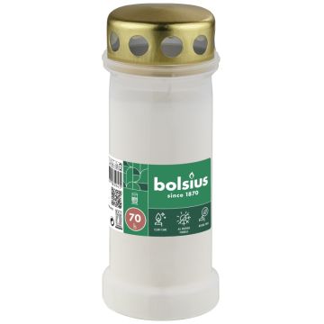 24 stuks Bolsius transparant witte grafkaarsen en graflichten nr. 6 voor herdenkingsavonden bij grafplaatsen of op plekken van stilte en rouw. Deze Bolsius "nummer 6" kaarsen met stalen deksel, branden perfect op, hebben een erg lange brandduur en roeten niet. Deze graflichten in transparante houder en goudkleurig deksel is bestand tegen weersinvloeden zoals regen en wat wind. De kleur is wit en de houder is transparant. De perfecte grafkaars om op een begraafplaats te plaatsen ook ideaal voor in een lantaarn te zetten. Een mooi graflicht om de dierbaren te herdenken, deze speciale binnen- en buitenkaarsen staan niet voor niets voor het eeuwige leven. Afmeting hoogte 173 mm x diameter 67 mm ( 17,3 cm x 6,7 cm ) Brandduur 70 uur, ( circa 3 dagen ) Bolsius Nr. 6 transparant / wit Besteleenheid 1 = 24 stuks